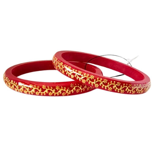• Classic red color with glossy polish• Beautiful golden floral vine design• Traditional ethnic craftsmanship• Lightweight and comfortable to wear• Suitable for bridal and festive occasions